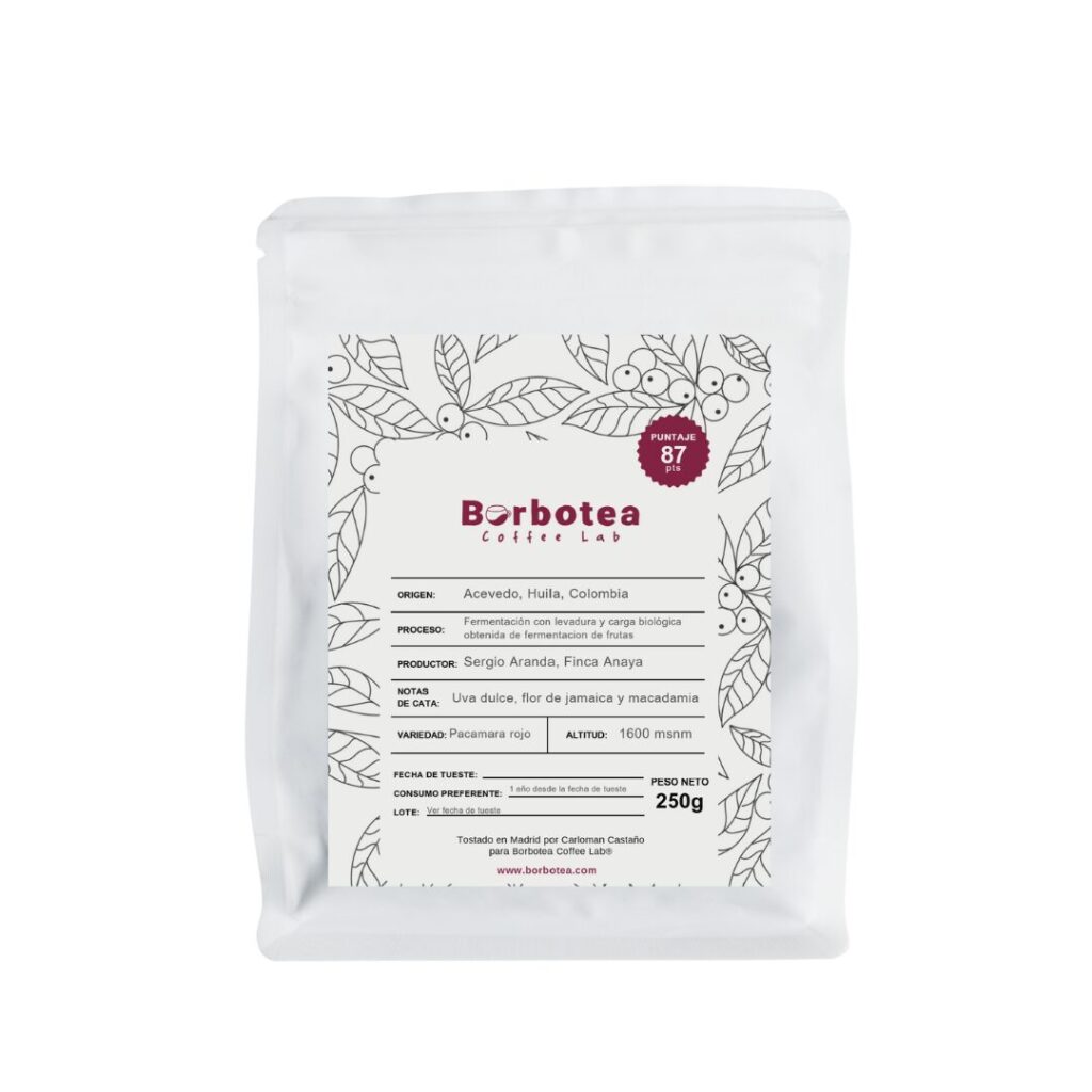 Café colombiano variedad Pacamara Rojo, proveniente del municipio de Acevedo en el Huila, cultivado a 1600 metros de altitud.